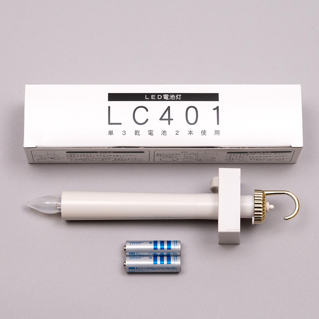 電源はコンセント不要なLED電池灯LC401が付属しています。コードを気にせず、設置場所を選びません(単3電池2個使用、約160時間連続点灯可能)。