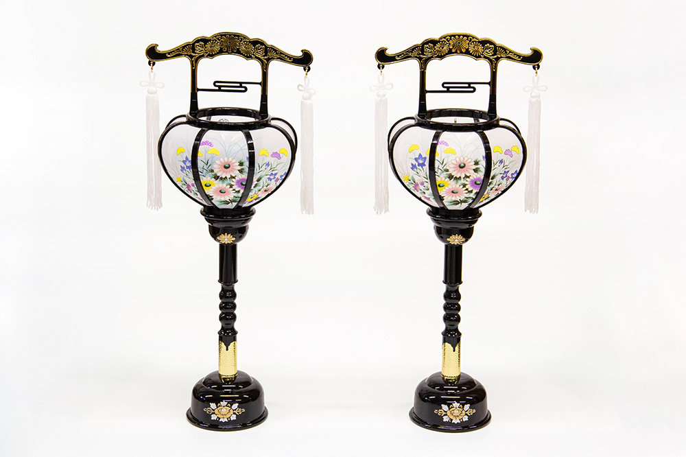 「廻転灯の光が故人を温かく迎え入れる。盆棚・仏壇周りを華やかに彩るコンパクトな霊前灯(一対)。」