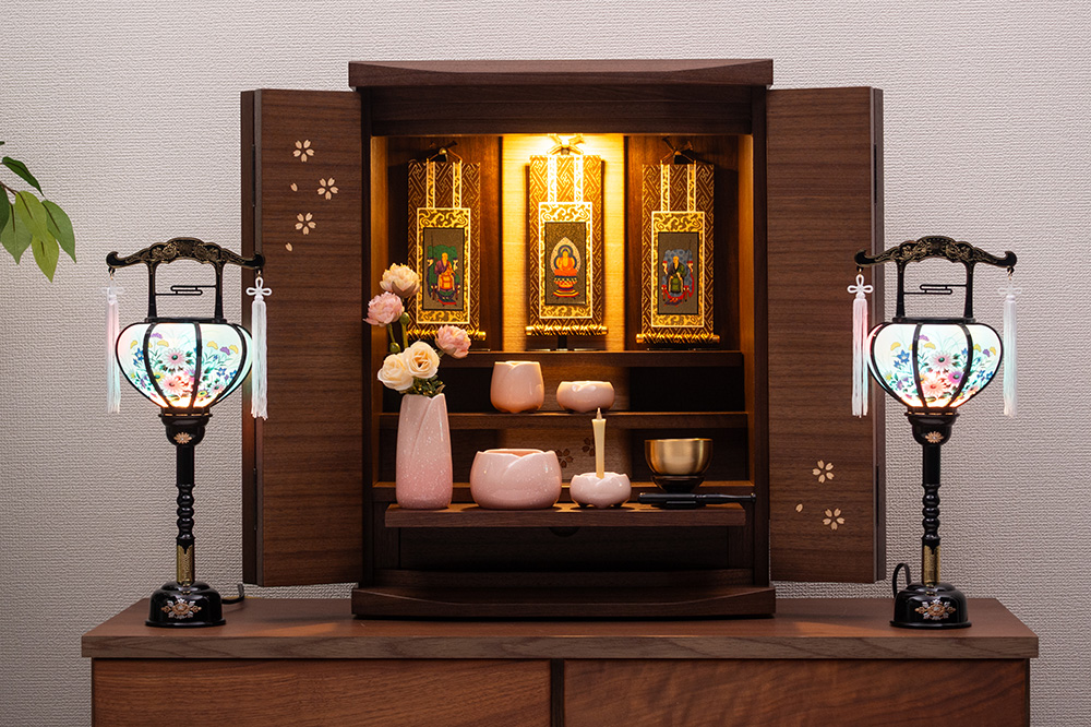 桜の花吹雪を思わせる優しい模様が、お仏壇に華やかさを与えます。