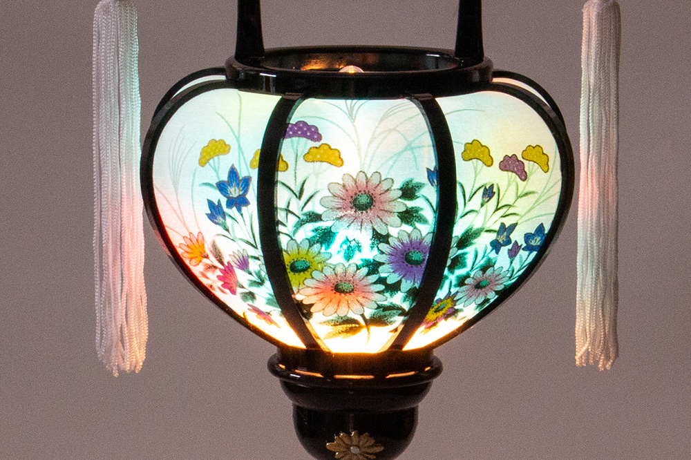 点灯すると光に照らされた鮮やかな花の絵柄がゆっくりと回ります。お盆らしい賑やかさと、温かな雰囲気を手軽に実現します。