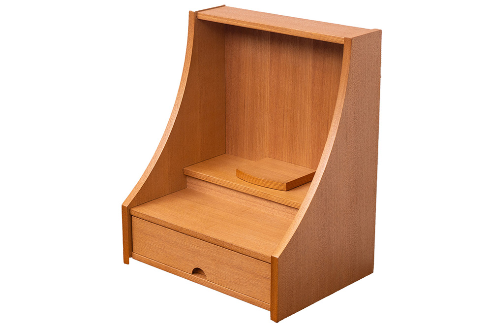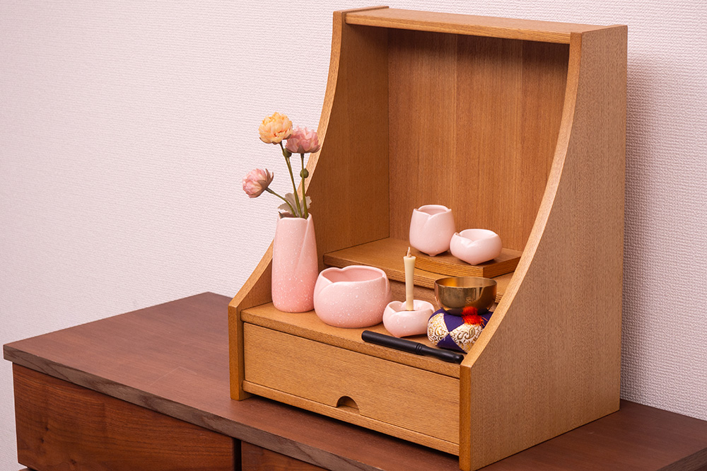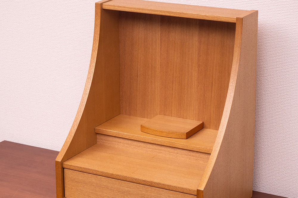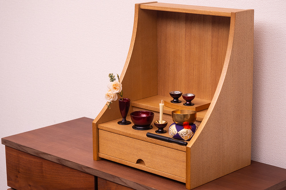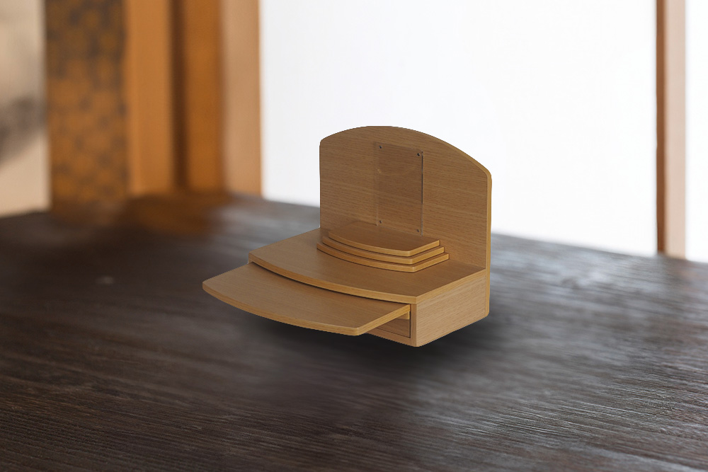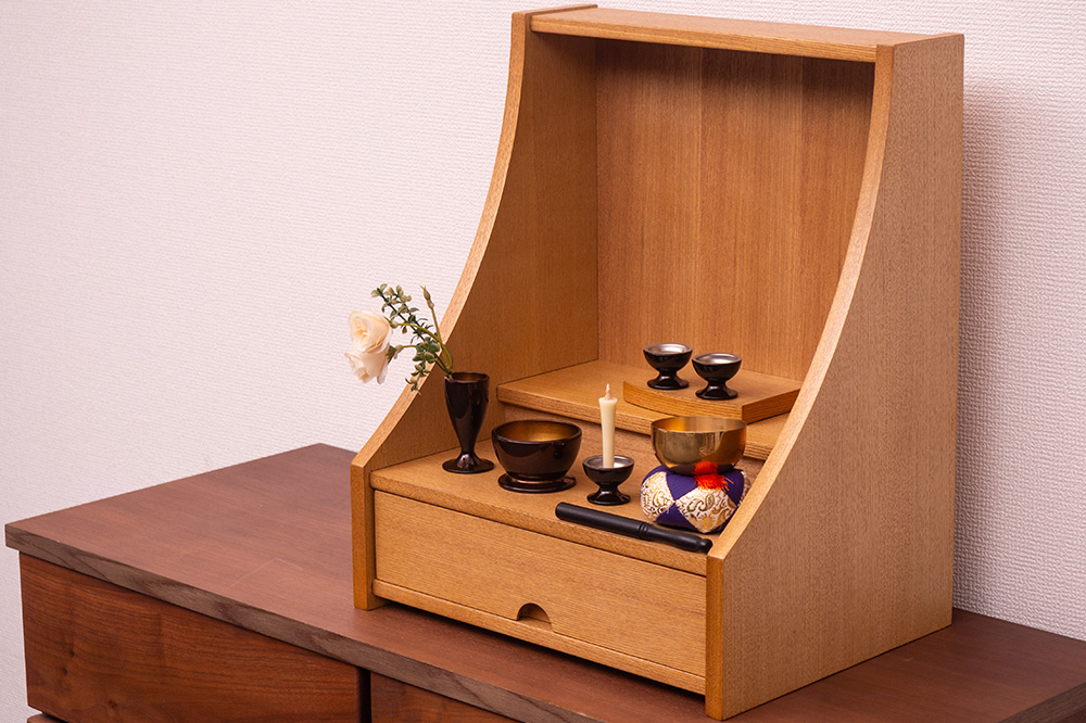 明るい色ライト色で木目と柔らかな曲線が美しく現代の住空間に自然と馴染みます。引き出し収納やスライド棚も備わっており、日々のご供養に必要な道具をすっきりと収められる機能性も魅力。家具のように洗練された佇まいで、心を整える時間を静かに支えてくれる一台です。