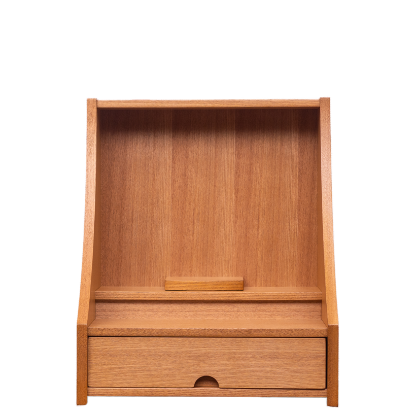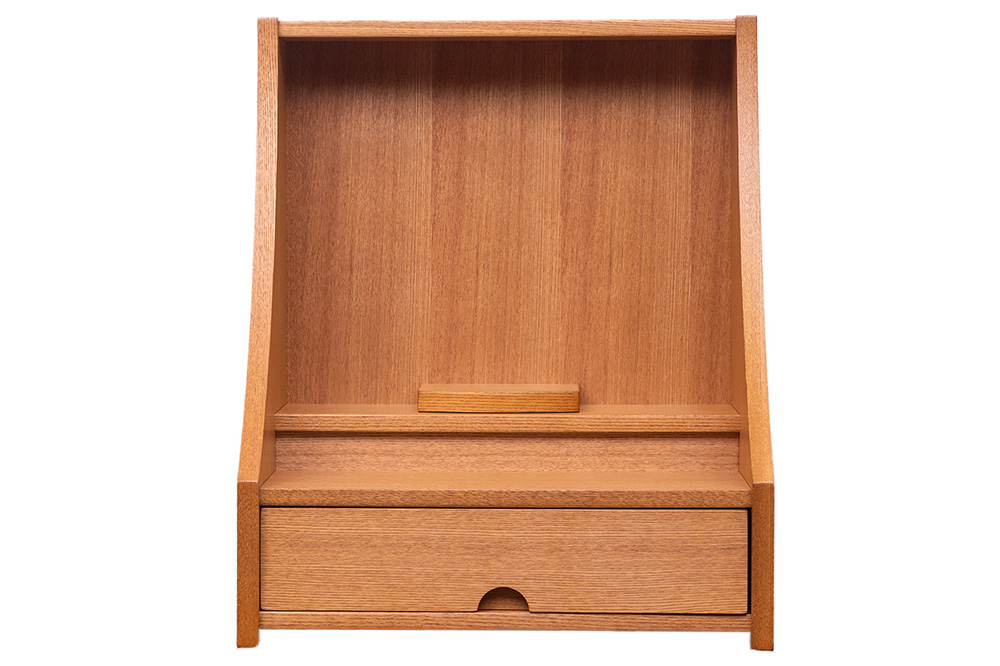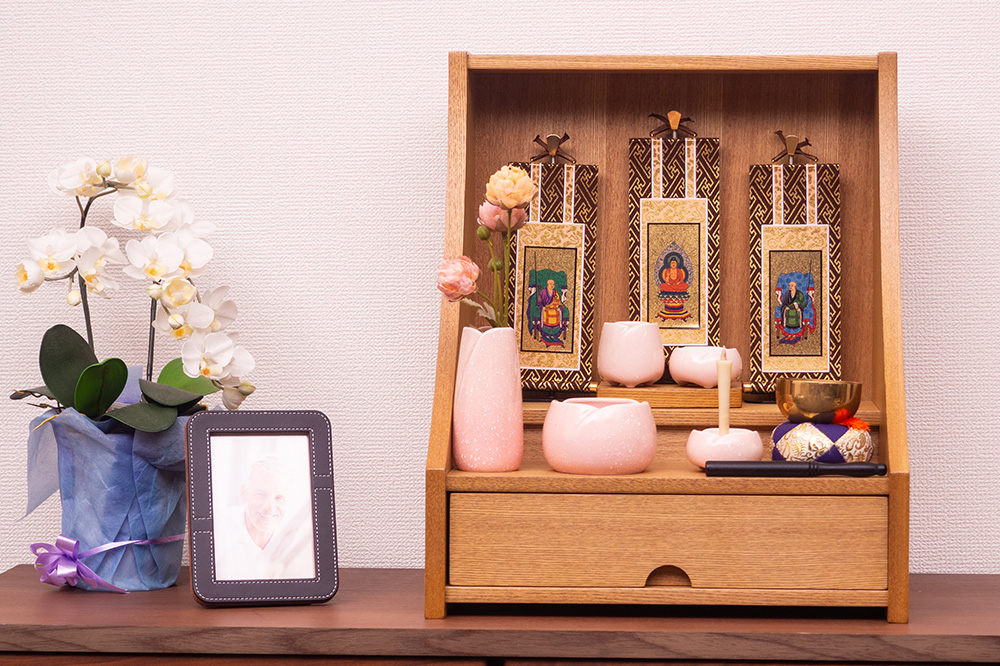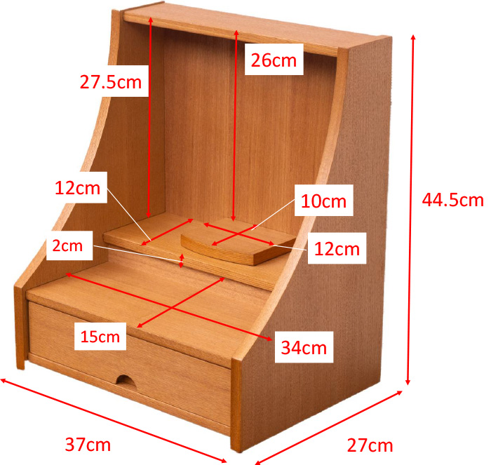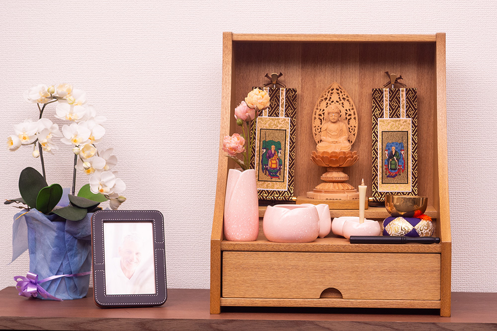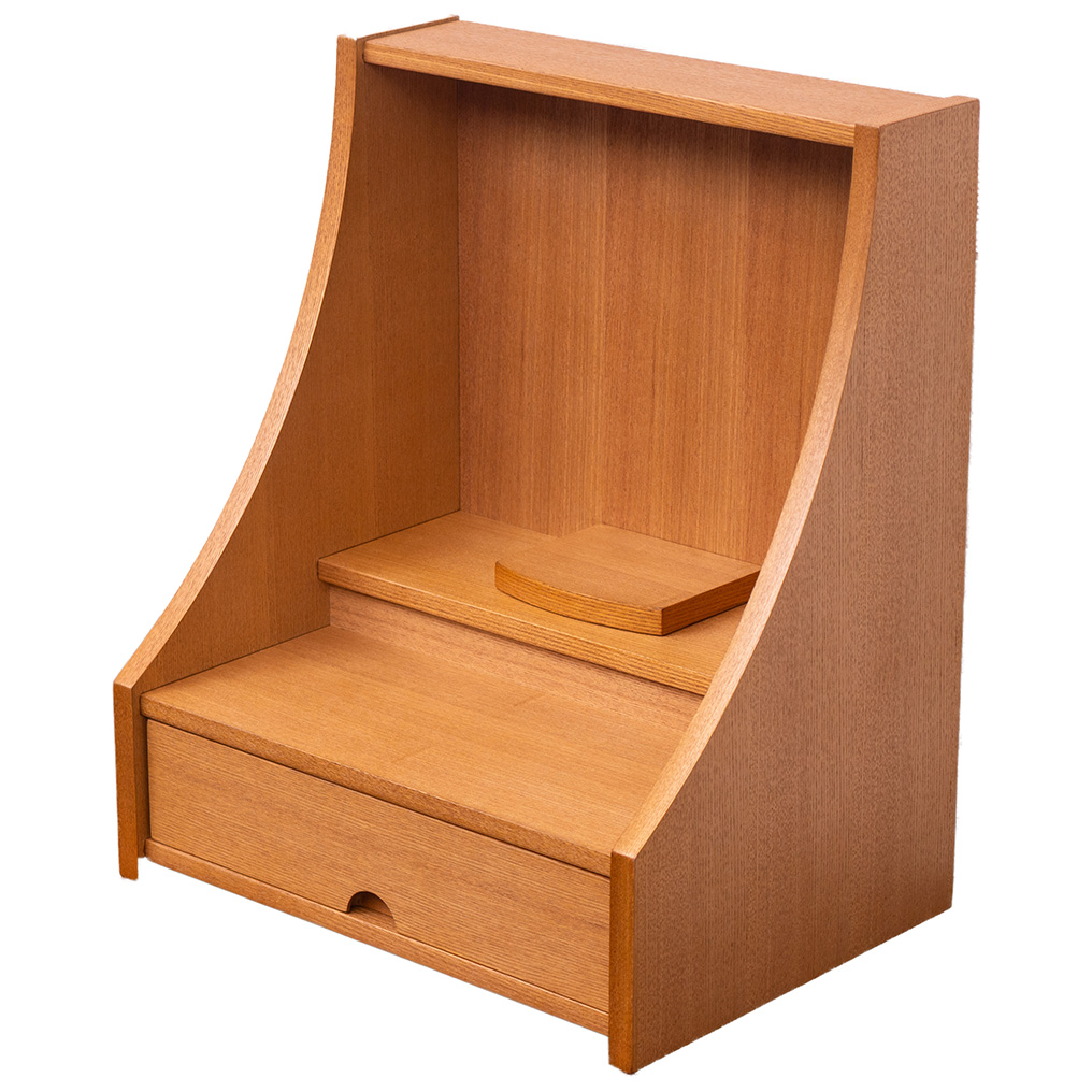 明るい色ライト色で木目と柔らかな曲線が美しく現代の住空間に自然と馴染みます。引き出し収納やスライド棚も備わっており、日々のご供養に必要な道具をすっきりと収められる機能性も魅力。家具のように洗練された佇まいで、心を整える時間を静かに支えてくれる一台です。