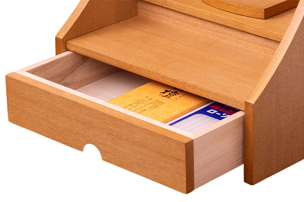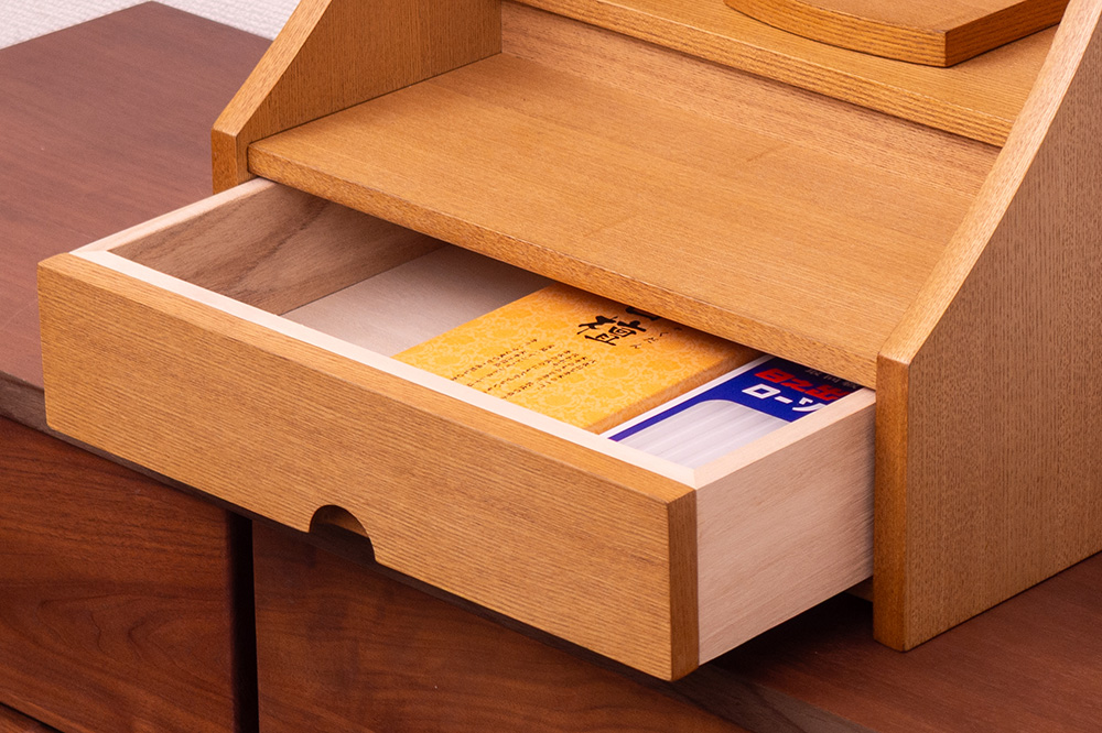 下部の引き出しは収納性に優れ、仏具や小物をすっきりと収められます。