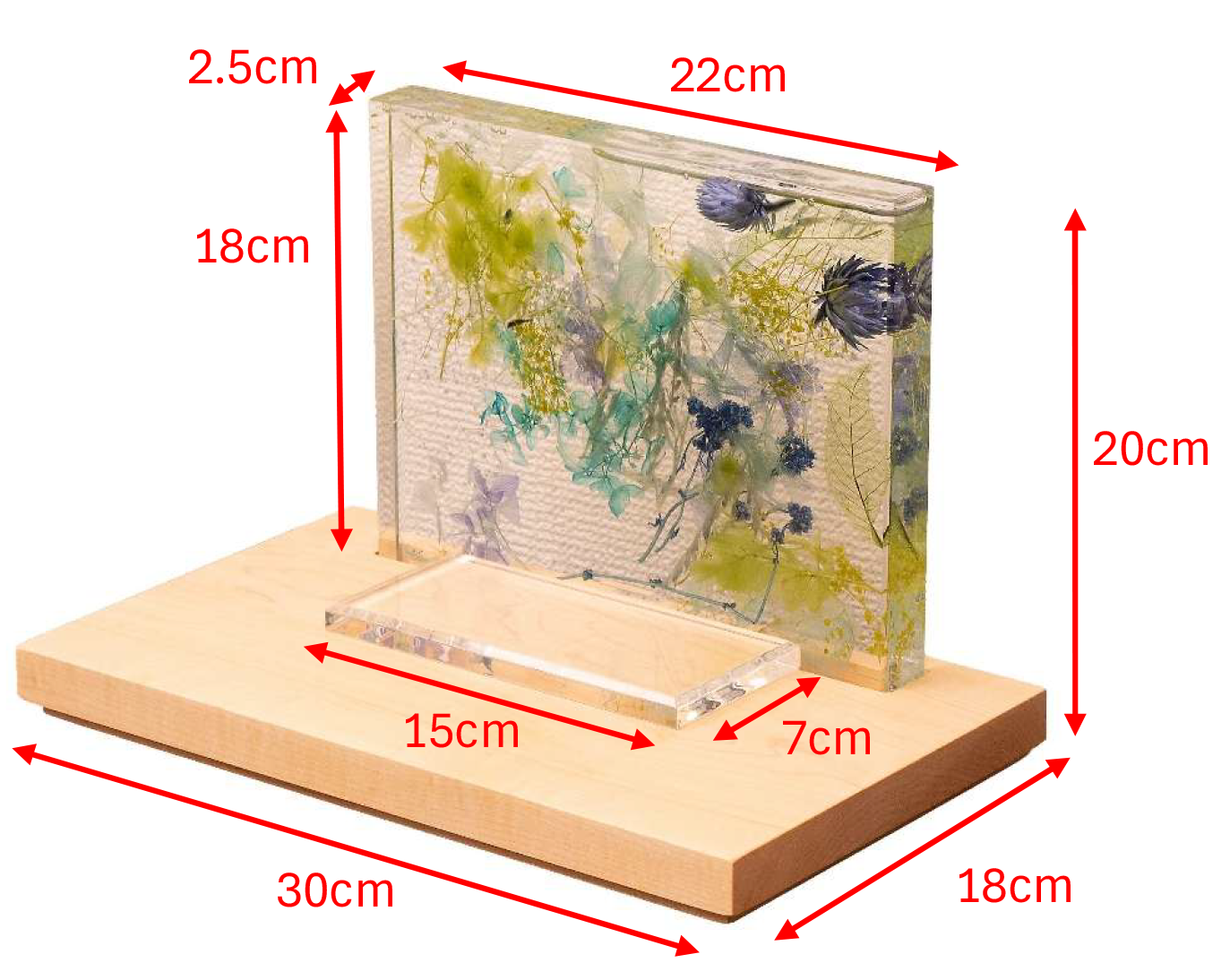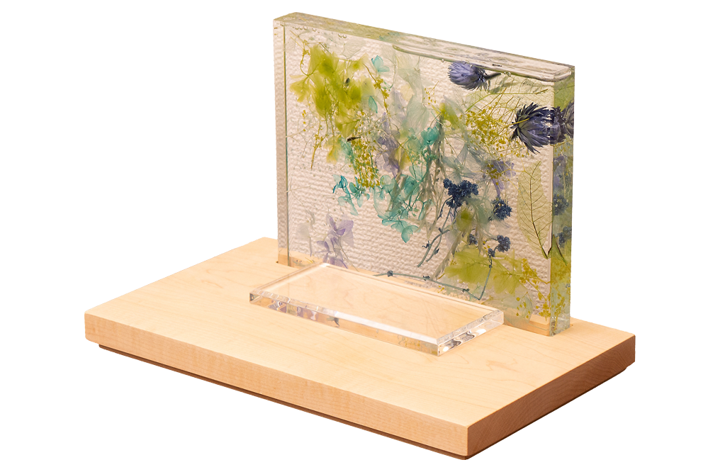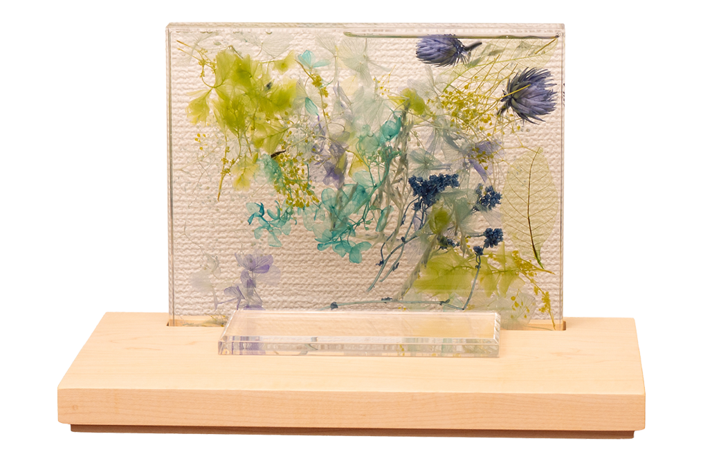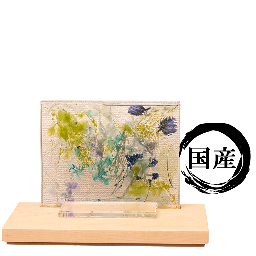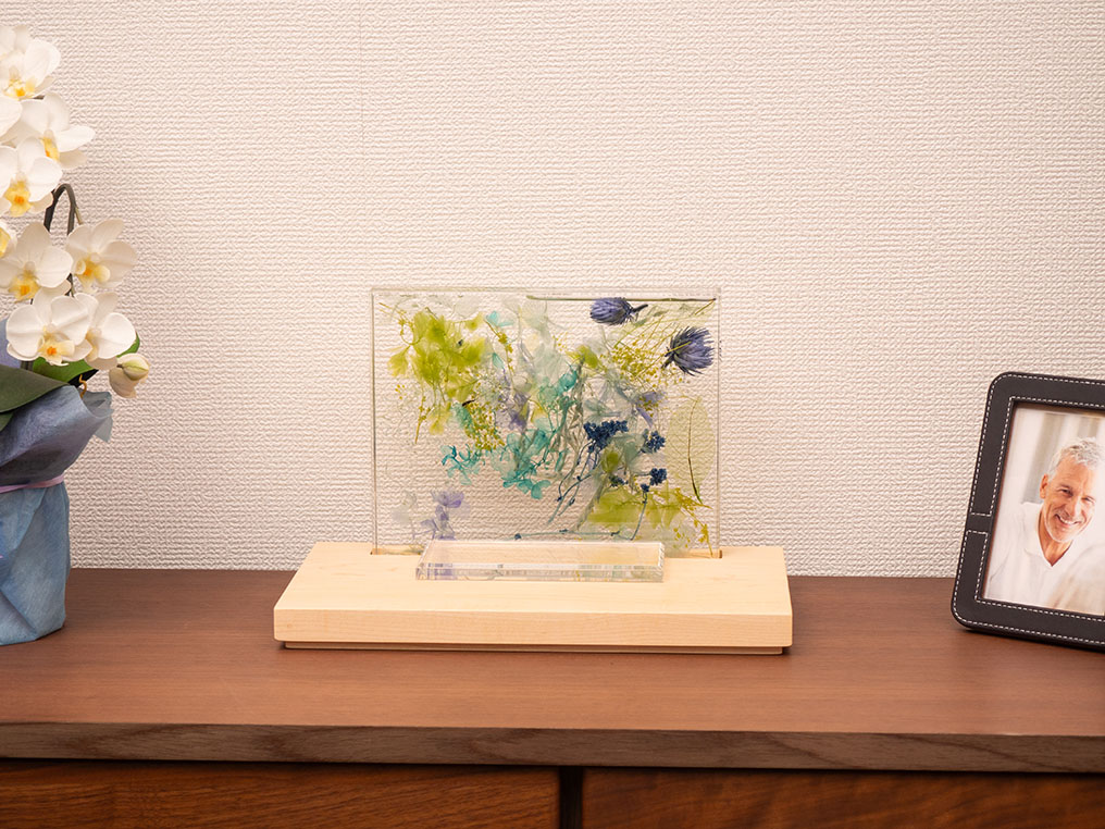 ブルーを基調とした色とりどりの草花を閉じ込めたハーバリウム型祭壇が、祈りの場にやさしい彩りと透明感を添えます。背に咲く花々は、時を超えて故人への想いを映し出し、見るたびに心が穏やかになるような癒しをもたらします。木製の台座はナチュラルな温もりを感じさせ、現代の住空間にも自然に溶け込みます。コンパクトなサイズ感で場所を選ばず、写真やお花と組み合わせて、自分らしい供養のかたちを演出できます。インテリアとしても美しく、日々の祈りをそっと支えてくれる、新しいメモリアルステージです。