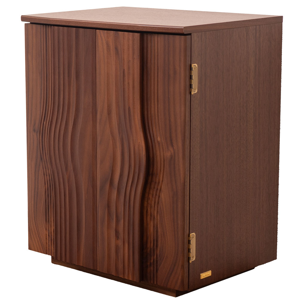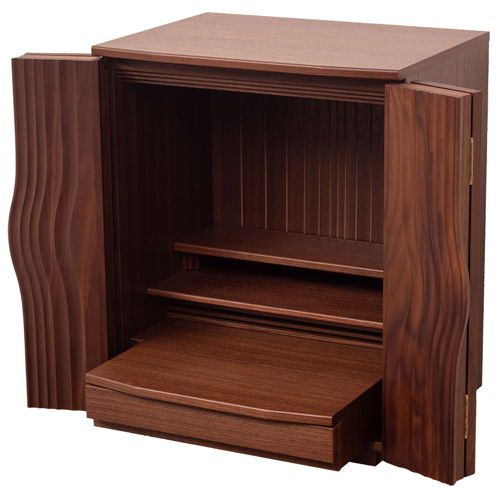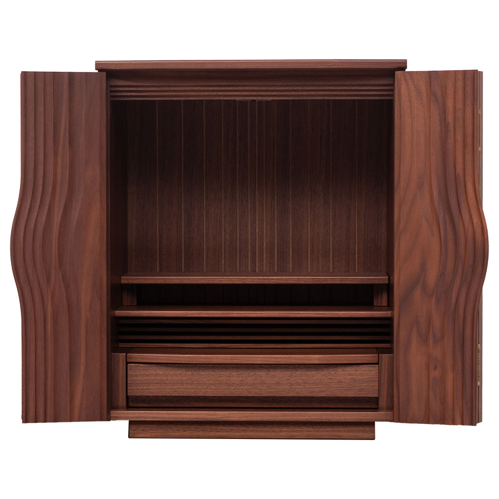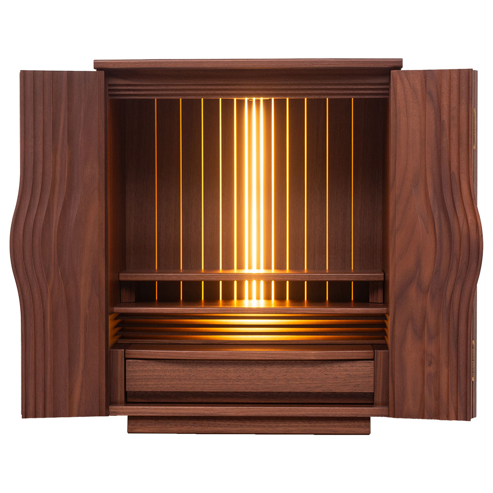 デザイナーズ仏壇で、大戸には木目を人生の波紋で表現しております。美しい木目の曲線と細部にこだわった作りで美しい仕上がりになっております。