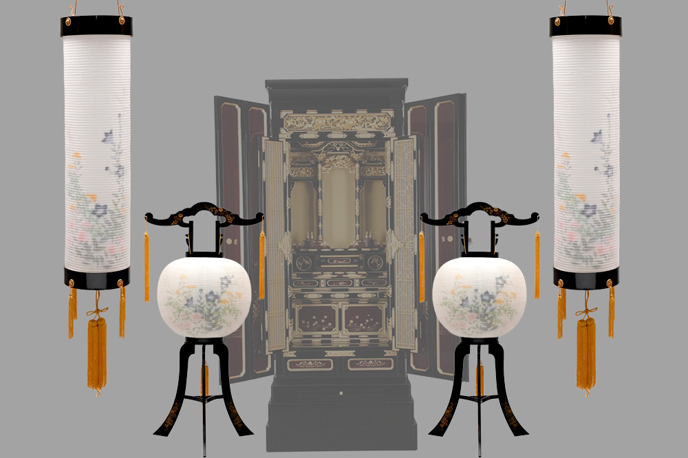 「特撰黒」の住吉と、蒔絵を施した行灯が、落ち着いた中にも高級感のある祭壇を演出します。