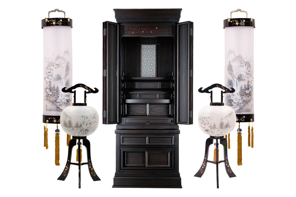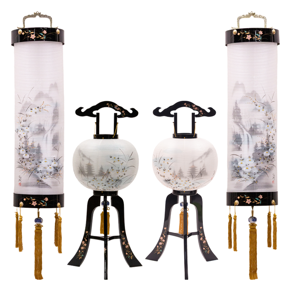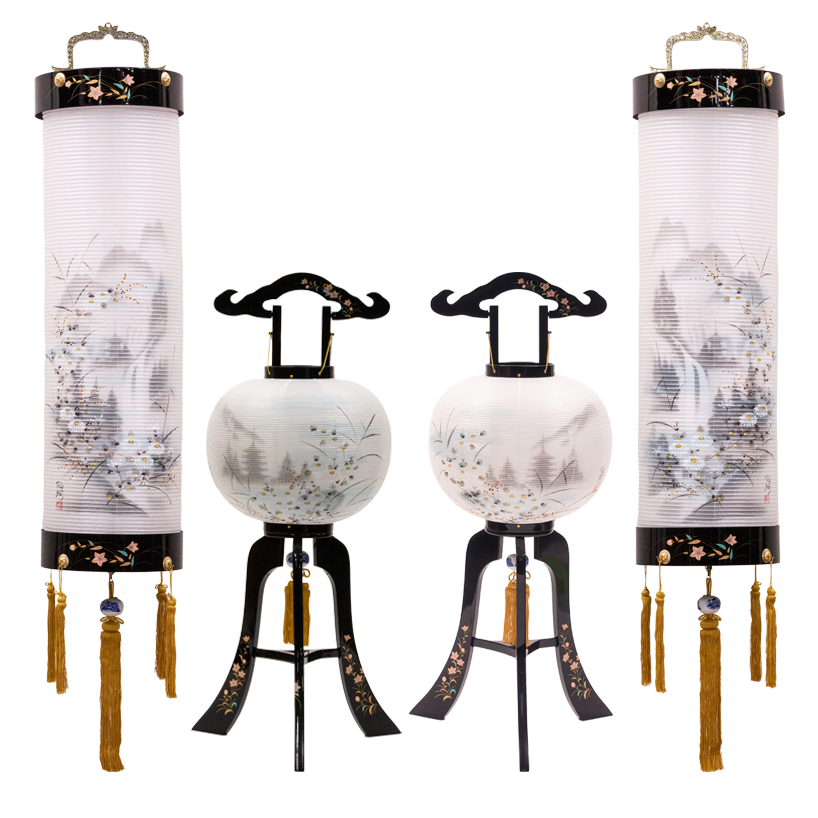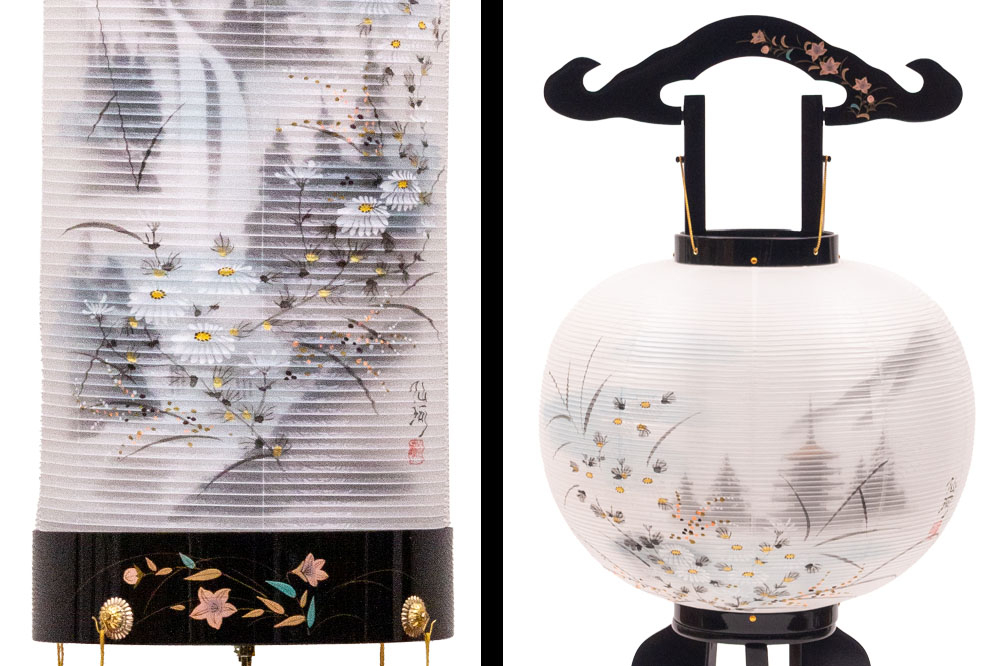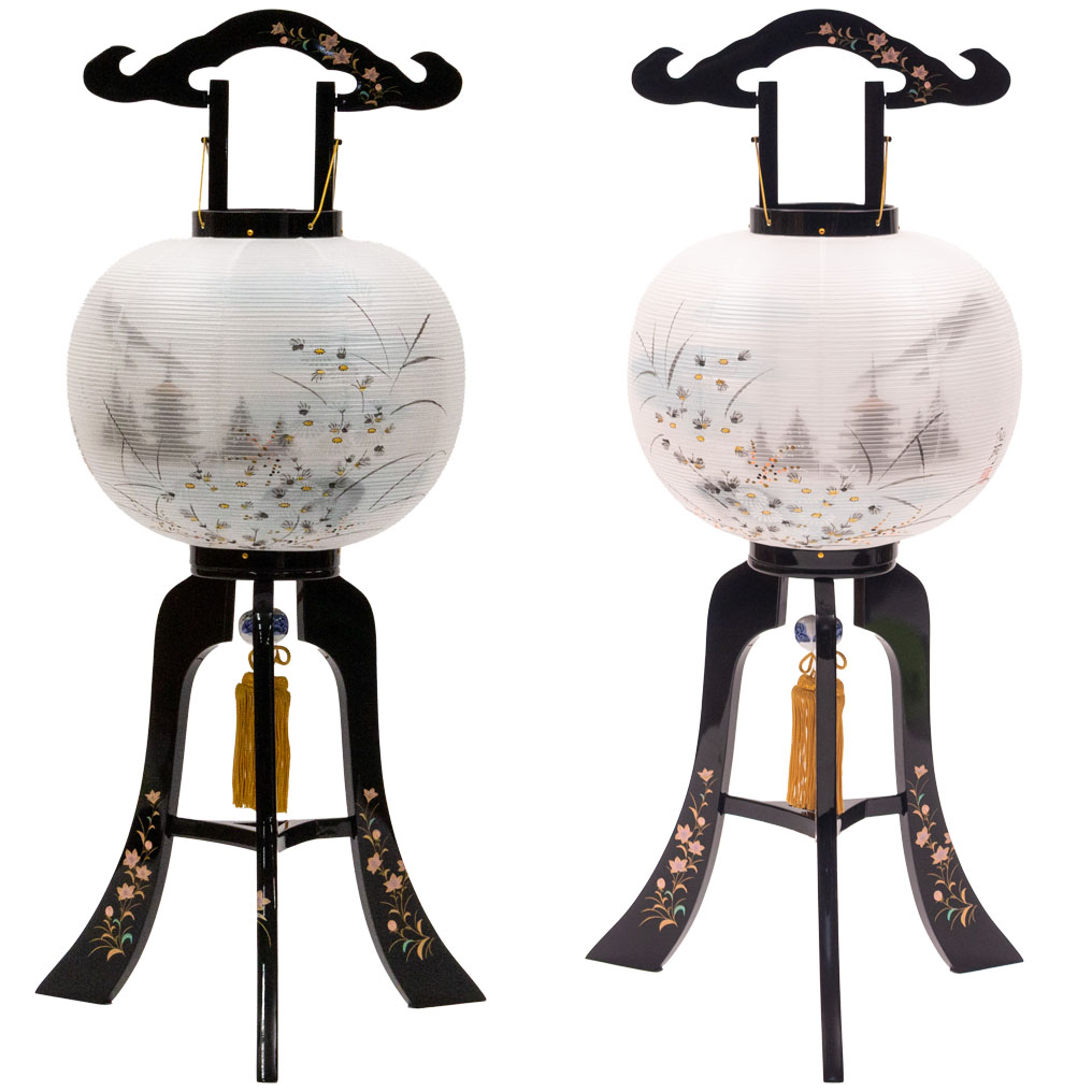 住吉 : 天然木・絹二重張(本体:蒔絵入) 行灯 : 天然木・絹二重張(本体:蒔絵入) |