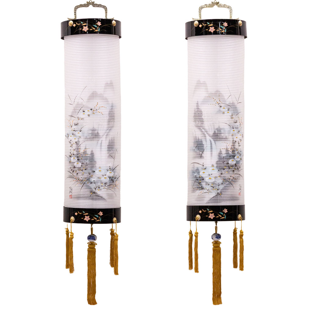 五重塔を望む静寂な風景と菊の共演。絹張りの質感が際立つ、格調高き盆提灯セット。