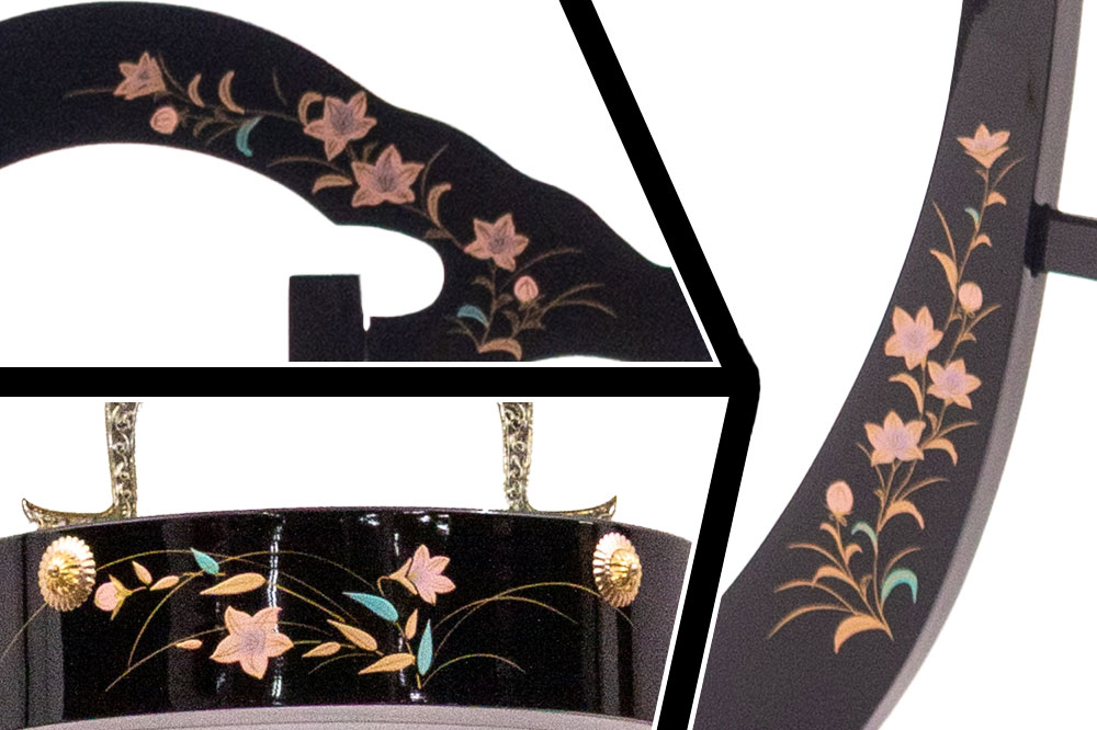 行灯の手(上部の木製部分)や足の分、住吉には上下の上輪と下輪に「豪華な蒔絵」が施されており塔の絵柄を引き立たせてくれます。