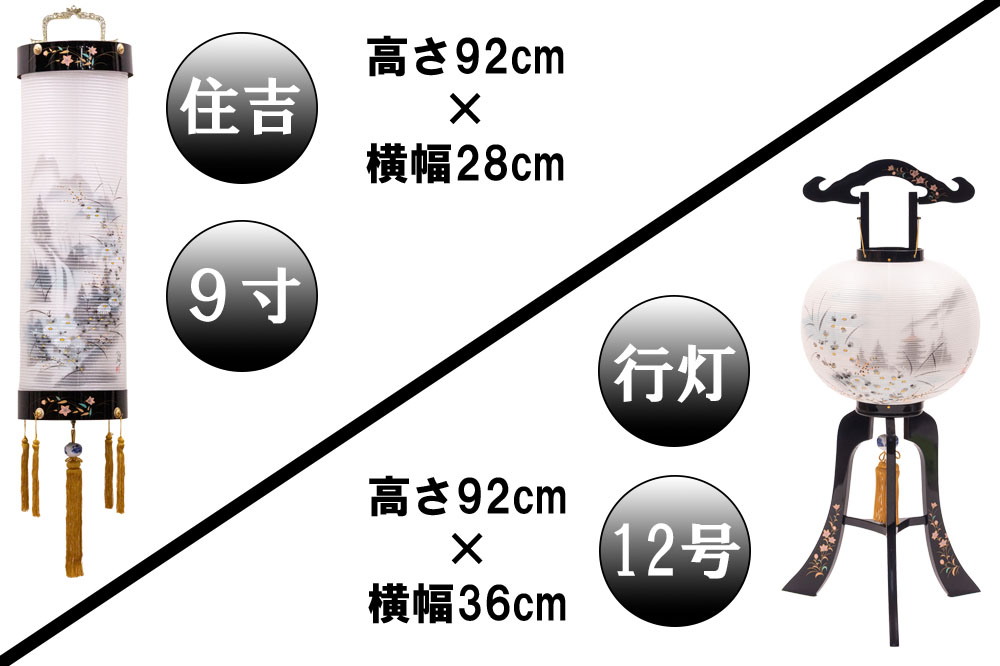 住吉 : 高さ92cm × 幅28cm 行灯 : 高さ92cm × 幅36cm ※セット写真の大きさはイメージです。 |