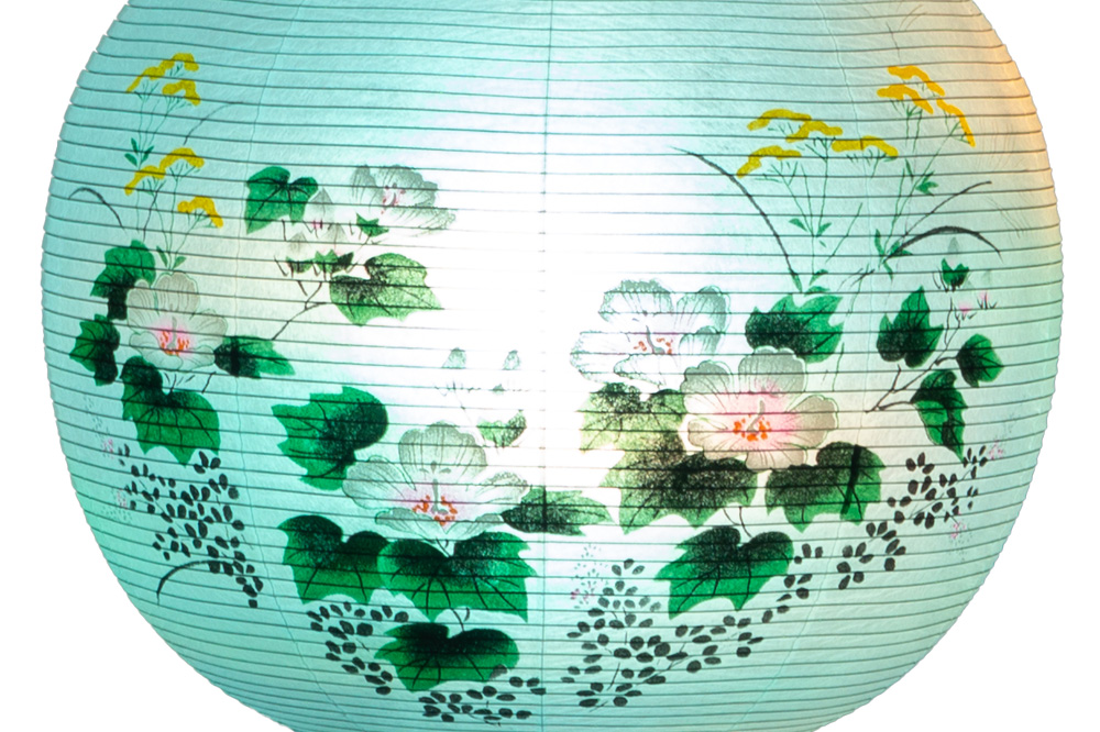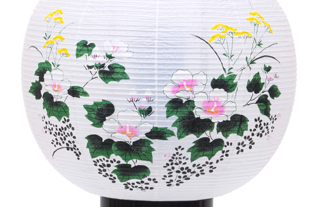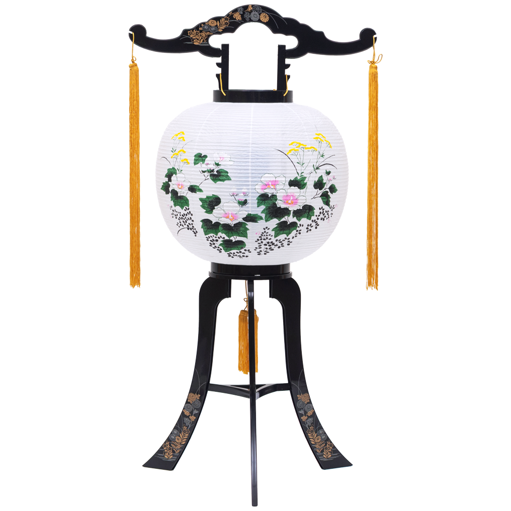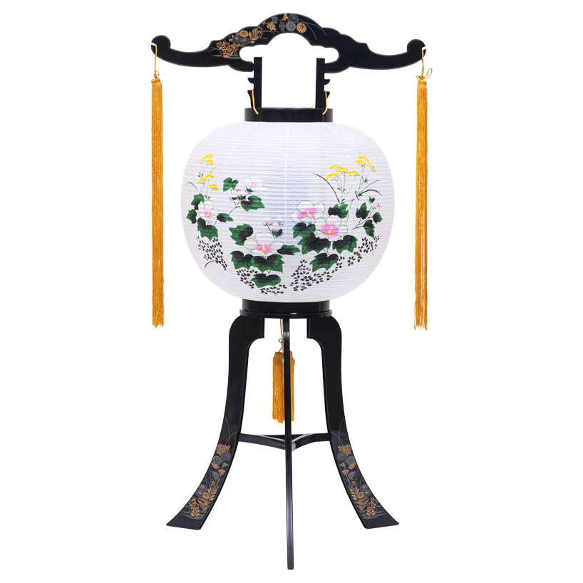 軽量なPC(プラスチック)製台座と華やかな花柄が特徴の置き型提灯。やさしい灯りがお盆の夜を彩ります。