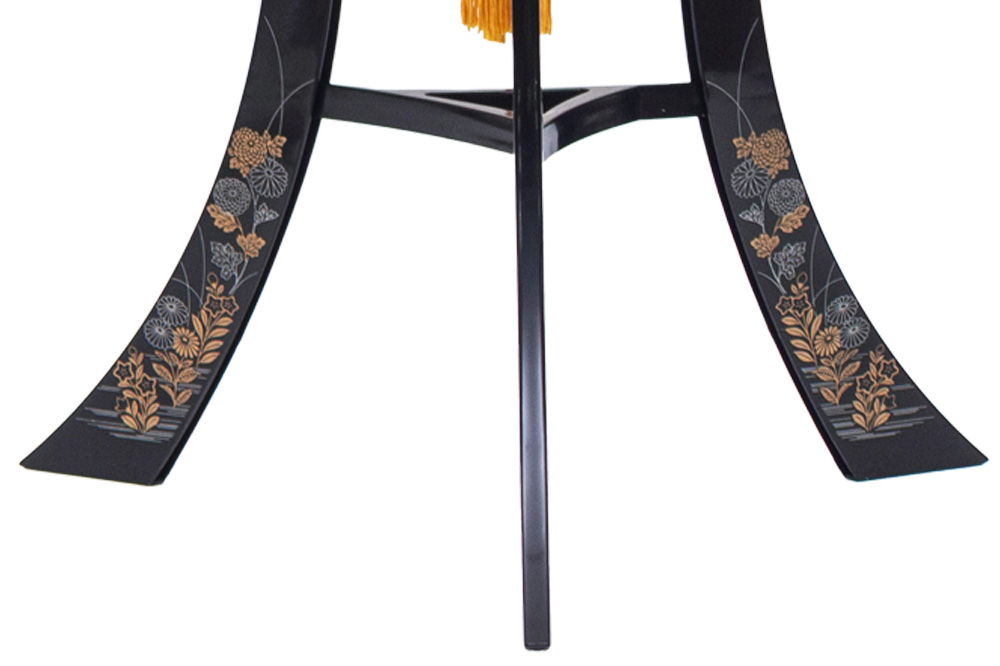 台座はPC(プラスチック)製で、軽量かつ耐久性に優れています。黒塗り風の加工と金色の花柄が施されています。