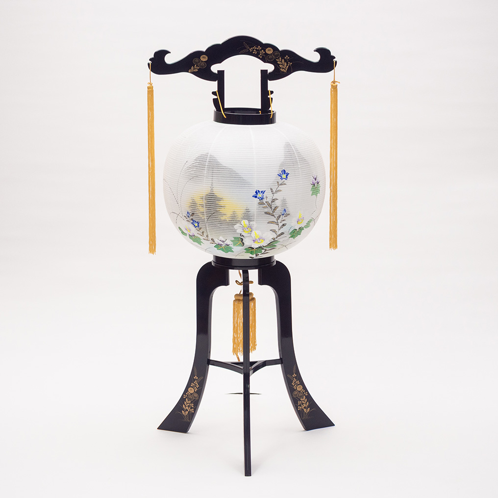 火袋には、山水の風景と五重塔の荘厳な情景、そして桔梗や菊などの秋の草花(八千代)が鮮やかに描かれています。