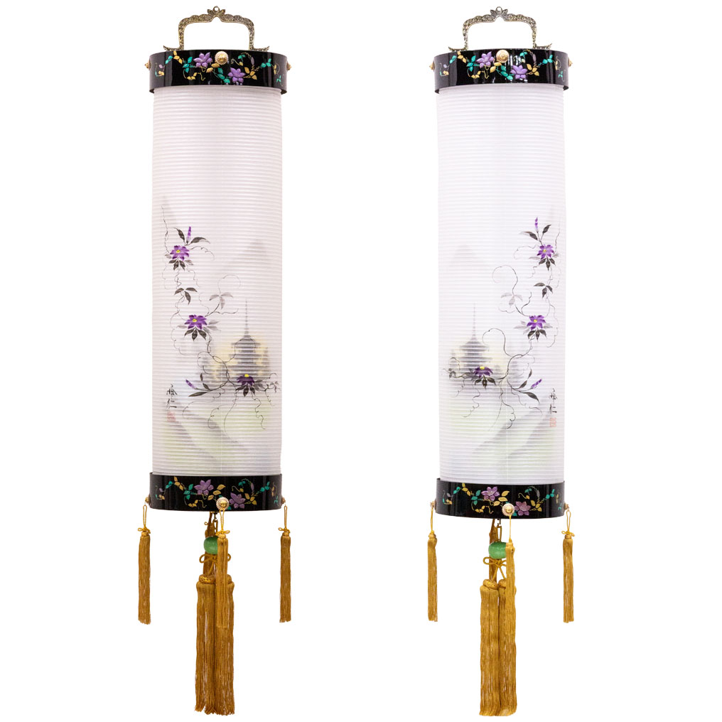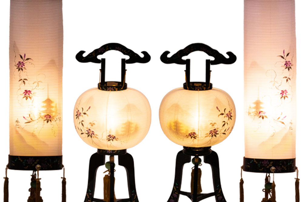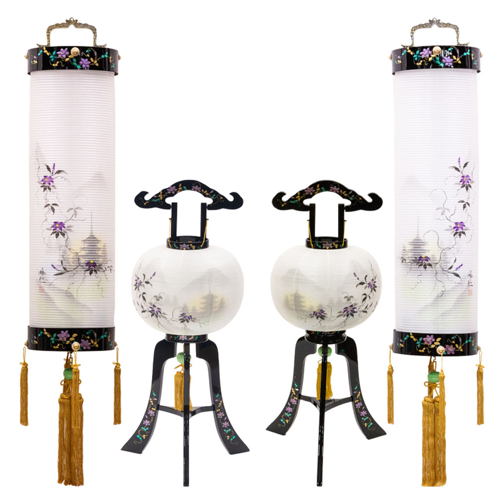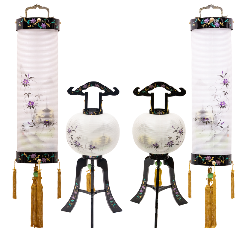 住吉 : 天然木・絹二重張(本体:蒔絵入) 行灯 : 天然木・絹二重張(本体:蒔絵入) |