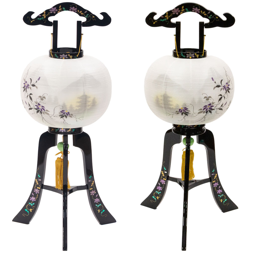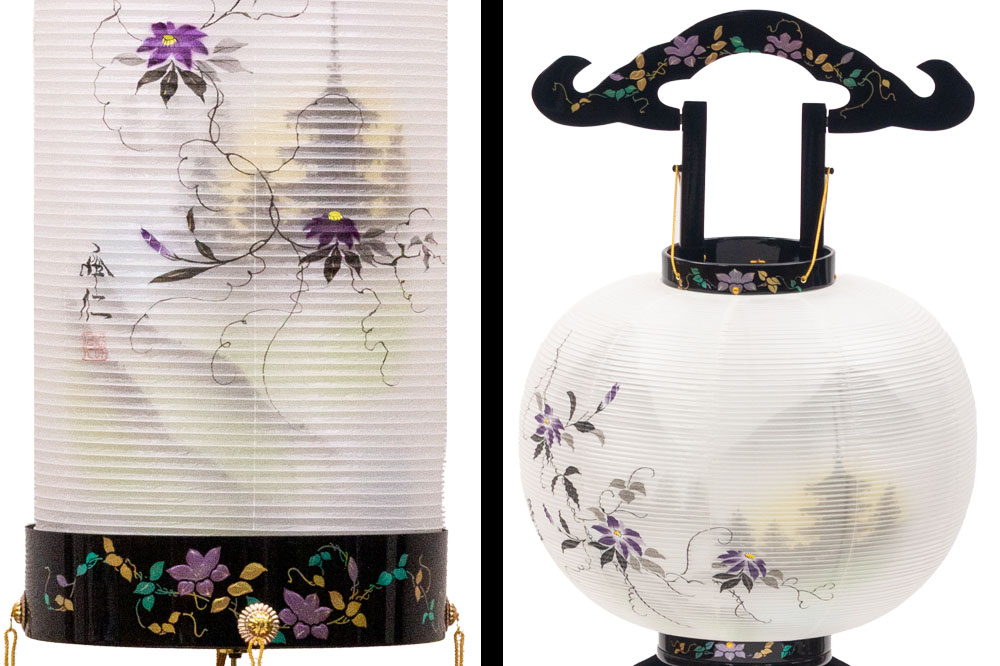 凛と咲く鉄仙(てっせん)の気品。蒔絵の輝きと絹張の明かりが、静かな祈りの場を彩ります。