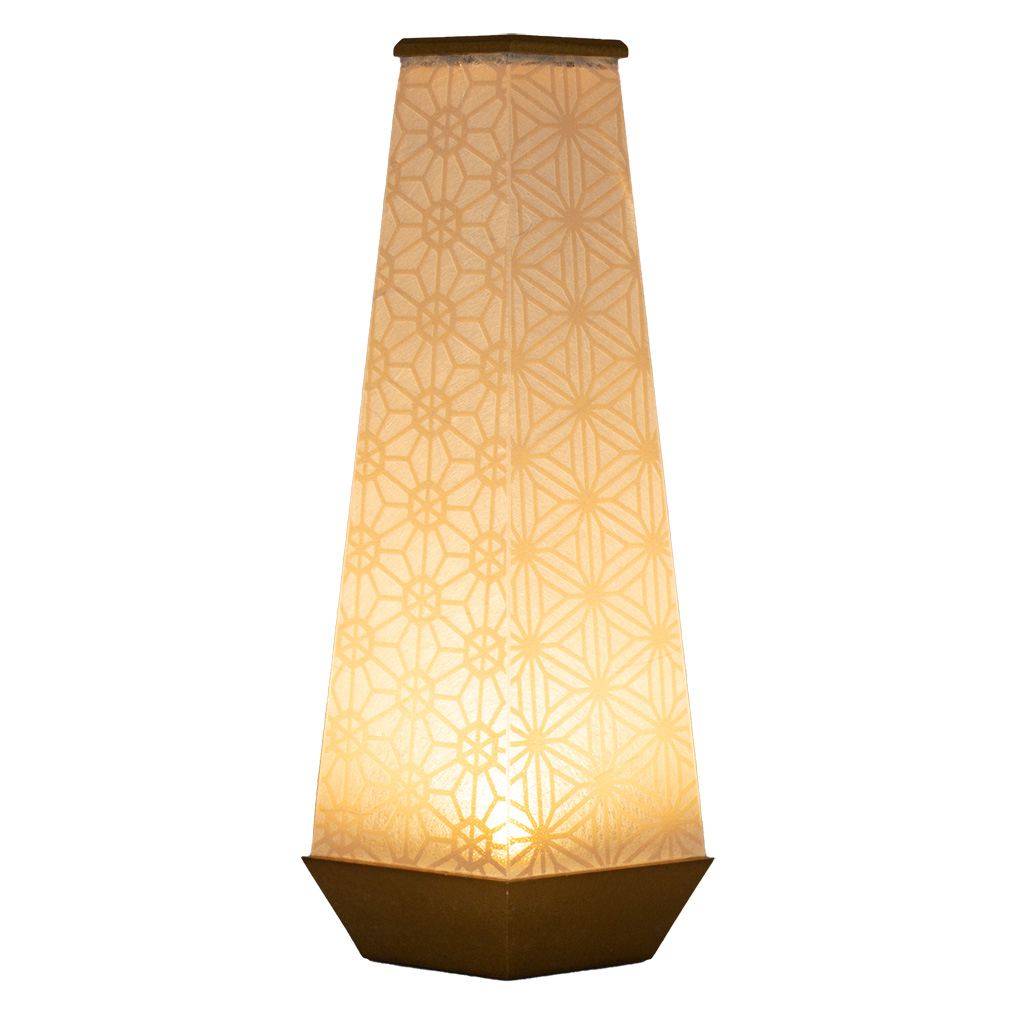 (約)高さ21.0cm×直径9.5cmの省スペース設計。火袋には、岐阜県産の美しい美濃和紙(薄口雲竜紙)を使用。淡い色合いのコスモス(秋桜)がグラデーションで描かれ、明かりを灯すと和紙の柔らかな質感とともに、空間を優しく包み込みます。