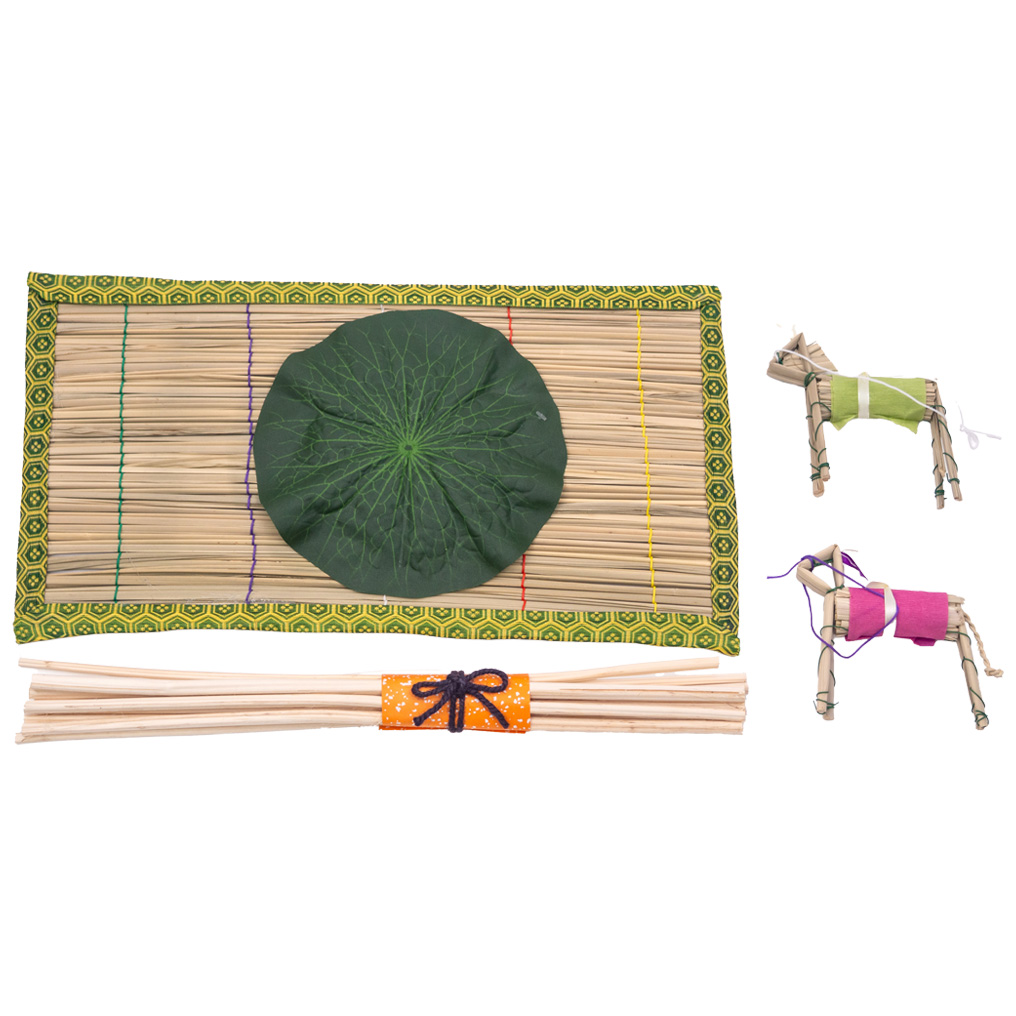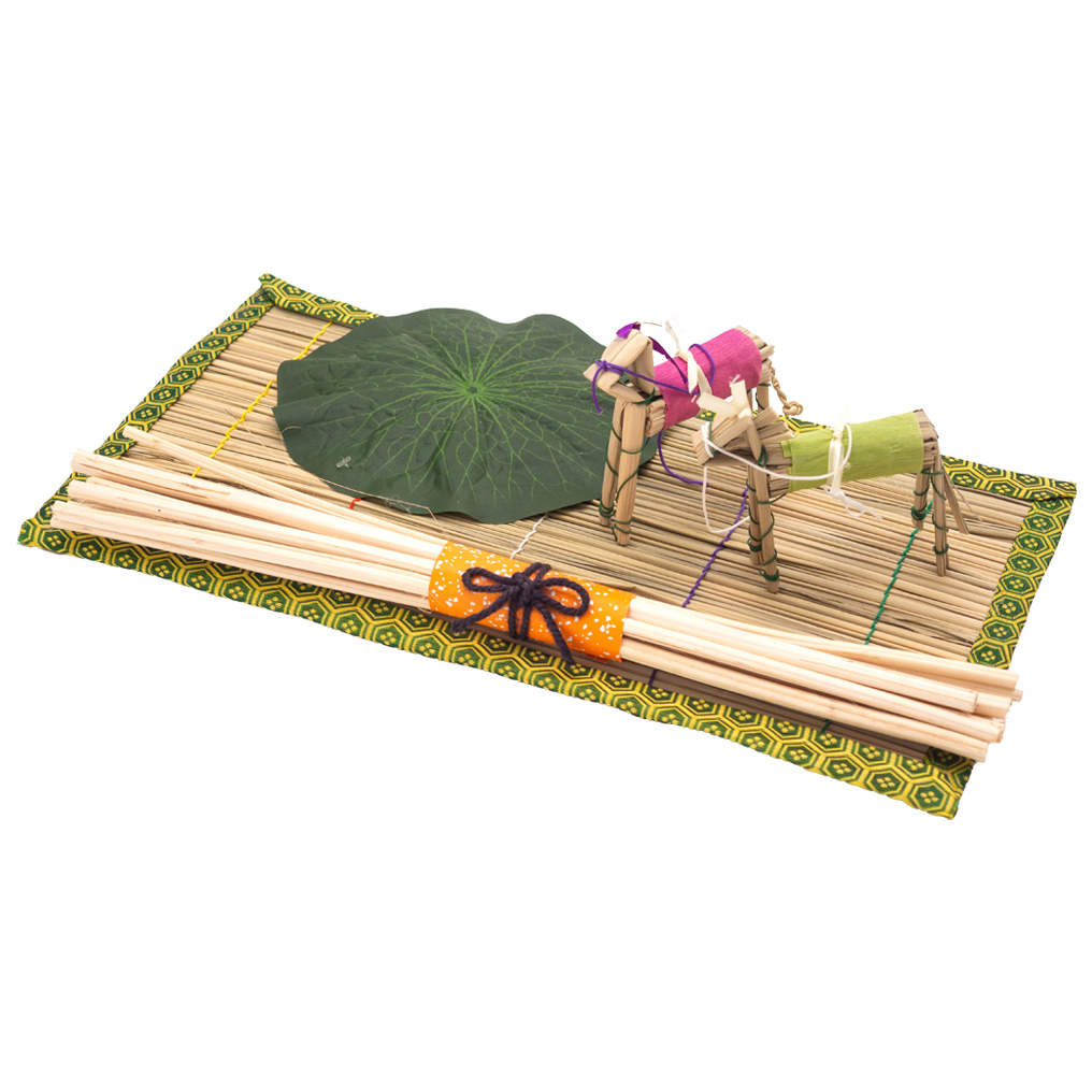 省スペースに飾れる「耳無し」仕様の真菰マットが入ったコンパクトな基本セット。真菰マット、蓮の葉、麻がら、そして精霊馬(牛馬)を作るための足など、お盆の迎え火・送り火や供物台の準備に必要な基本の道具が揃っています。