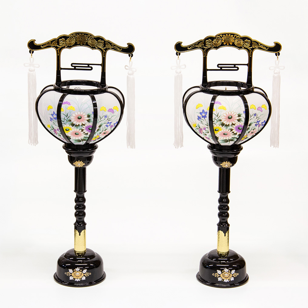 伝統的な行灯のなかでも特にコンパクトなサイズです。モダン仏壇や小型の仏壇、棚の上など、限られたスペースでも本格的なお盆飾りが整えられます。左右に1つずつ飾れる2個一組(1対)のセットです。電球を灯すと、熱で回転筒がゆっくりと回り、火袋に描かれた絵柄が幻想的に浮かび上がります。