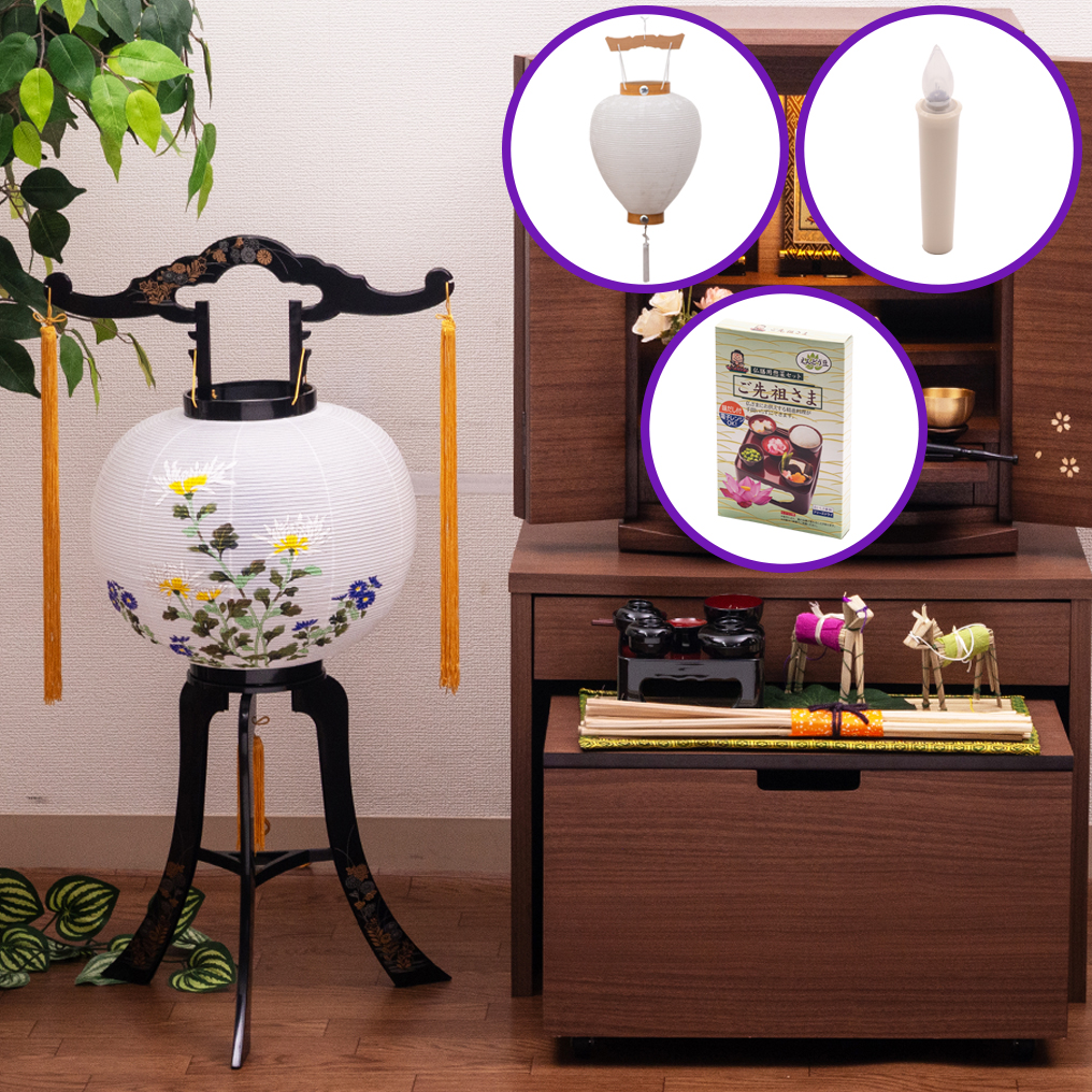 耳無心まちセットと吊り提灯 (白紋天 中尺) 、安全ローソク (小)、お霊供膳、ご先祖さまも付いた6点セット